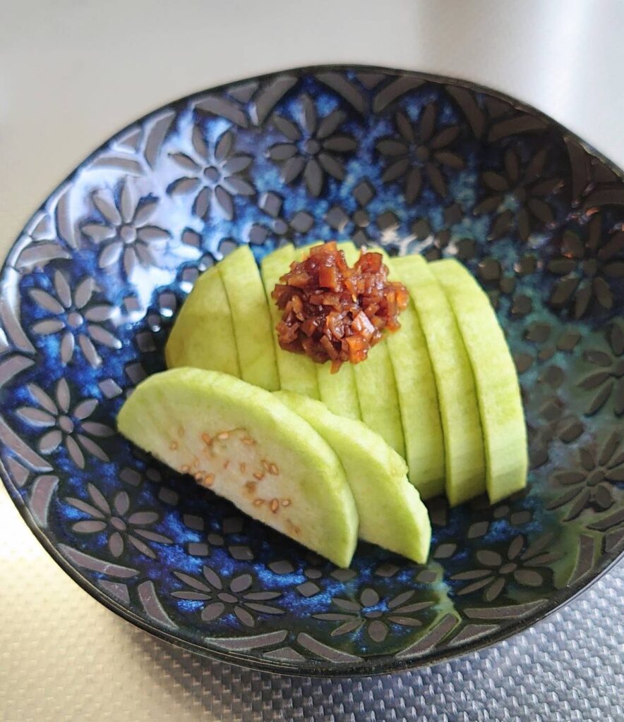 写真は、緑ナスの料理です(お客様から届きました)。フカフカ、サクサク、瑞々しく、メロンのような風味とのことです。